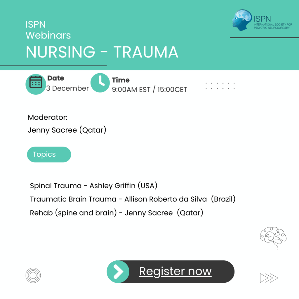 In 2024, the ISPN Nurses & Allied health professionals committee started their own a separate webinar program to provide education for & by pediatric neurosurgery nurses globally. The 2024 sessions can be revisited on the ISPN YouTube channel.